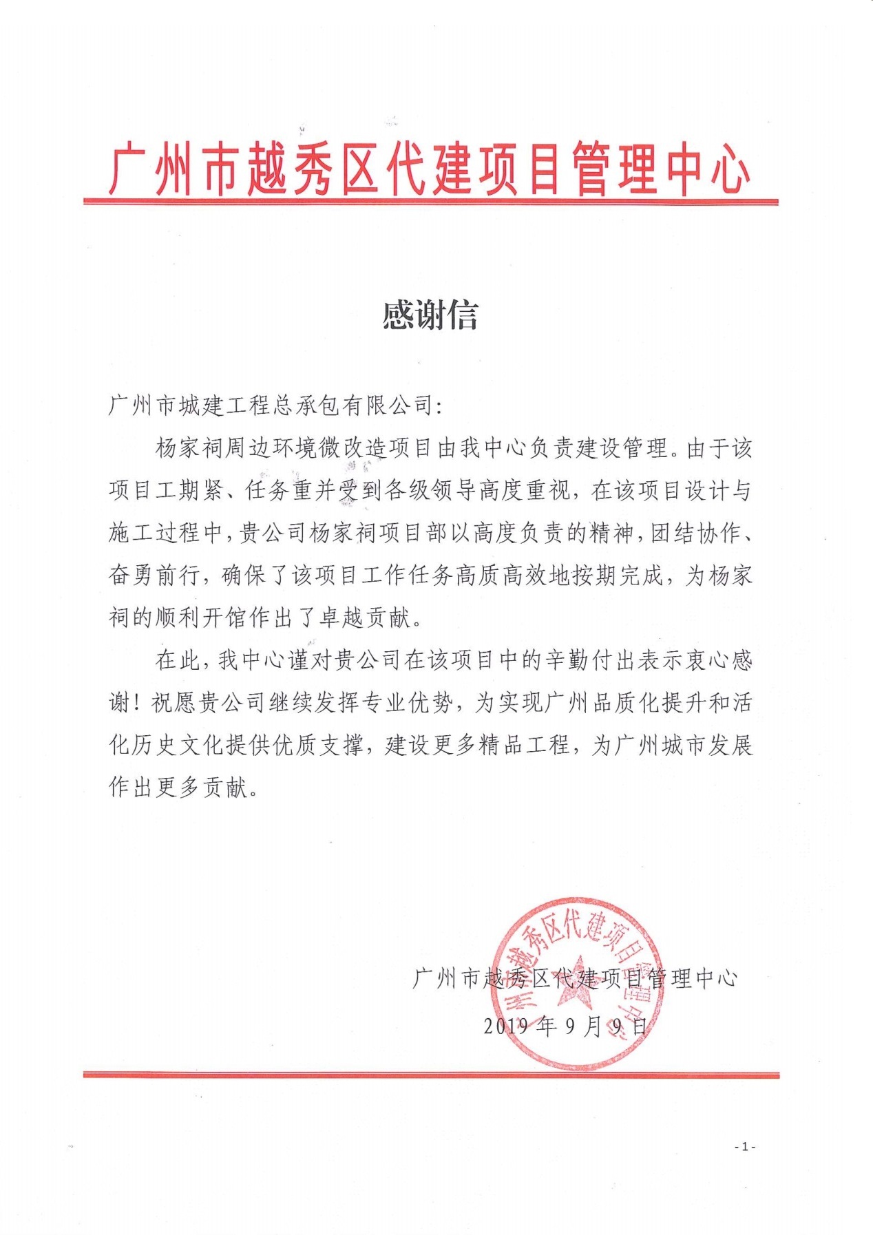 近期,楊家祠周邊環(huán)境微改造項(xiàng)目的建設(shè)單位——廣州市越秀區(qū)代建項(xiàng)目管理中心發(fā)來了感謝信,項(xiàng)目屬地居委——北京街道廣衛(wèi)社區(qū)居委會(huì)也送來了錦旗,表達(dá)了對楊家祠項(xiàng)目部工作的充分肯定和感謝。